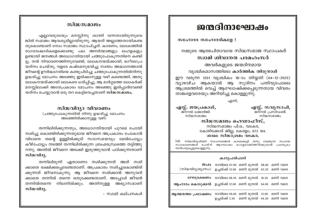 പൂമുഖംadmin2025-10-31T13:16:23+00:00 "സിദ്ധസമാജം" വെബ്സൈറ്റിലേക്ക് സ്വാഗതം ഈശ്വരതത്വം കൂടുതലറിയുക ഗുരുതത്വം കൂടുതലറിയുക ജീവകാരുണ്യം കൂടുതലറിയുക വിഗ്രഹാരാധന കൂടുതലറിയുക മതം കൂടുതലറിയുക ജാതി എന്നാല് എന്ത്? കൂടുതലറിയുക ജനറൽ പ്രസിഡന്റിൽ നിന്നുള്ള സന്ദേശം കൂടുതലറിയുക ആഘോഷം കൂടുതലറിയുക വീഡിയോ Please enable JavaScript LinkEmbedCopy and paste this HTML code into your webpage to embed. കാര്ത്തിക മഹോത്സവ ക്ഷണക്കത്ത് ചിത്രങ്ങൾ അമർത്തുക