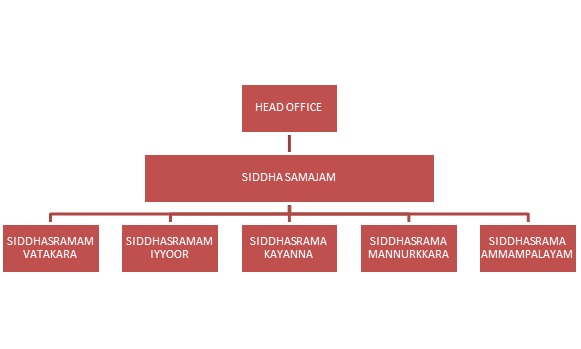 ജനറല് പ്രസിഡണ്ട്, ജനറല് കാര്യദര്ശി, ജനറല് പ്രതിനിധി, ജനറല് ഖജാന്ജി, മിനുട്ട് എഡിറ്റര് എന്നീ അഞ്ച് ഉദ്യോഗസ്ഥ മേധാവികളാല് സമാജ ഭരണം നിര്വ്വഹിക്കപ്പെടുന്നു. ഇവരെല്ലാവരും സമാജത്തിലെ പൊതുയോഗാംഗങ്ങളാല് (ജനറല് ബോഡി) തെരഞ്ഞെടുക്കപ്പെടുന്നു. സിദ്ധ സമാജത്തിന്റെ മേല്നോട്ടത്തിലുള്ള ഓരോ സിദ്ധാശ്രമവും ജനറല് പ്രസിഡണ്ടിനാല് നിയമിക്കപ്പെടുന്ന ഇതുപോലുള്ള അഞ്ചു ഉദ്യോഗസ്ഥന്മാര് നിര്വ്വഹിച്ചു പോരുന്നു. ഓരോ ആശ്രമത്തിലും ദിവസം പ്രതി താന് കാണുന്നതും കേള്ക്കുന്നതും ആയ സംഭവങ്ങളുടെ ഒരു സംക്ഷിപ്ത വിവരം കുറിക്കുന്നതിന് ഒരു നിത്യ മിനുട്ടറും ഉണ്ട്. നിര്വ്വഹണത്തിന്റെ തലപ്പത്തുള്ള ഉത്തരവാദിത്വം ജനറല് പ്രസിഡണ്ടിനാണ്. സിദ്ധ സമാജത്തിലെ ഏതൊരംഗത്തിന്റെ മേലും അച്ചടക്ക നടപടികള് എടുക്കുവാനും ആ അംഗത്തെ ശിക്ഷിക്കുവാനും പിരിച്ചുവിടുവാനും ഉള്ള പരമാധികാരം ജനറല് പ്രസിഡണ്ടിനുണ്ട്. എന്നാല് അദ്ദേഹവും സമാജചട്ടങ്ങളില് നിന്നും അകന്നുപോകുന്ന പക്ഷം സമാജം കൂടുന്ന പൊതുയോഗത്തിലെ വിചാരണക്കു വിധേയനായി ശിക്ഷാര്ഹനായിത്തീരുന്നതാണ്. ഇപ്രകാരം സമാജം പൂര്ണ്ണമായും ജനകീയ ഭരണ സംവിധാനമുള്ള ഒന്നായിരിക്കുന്നു.